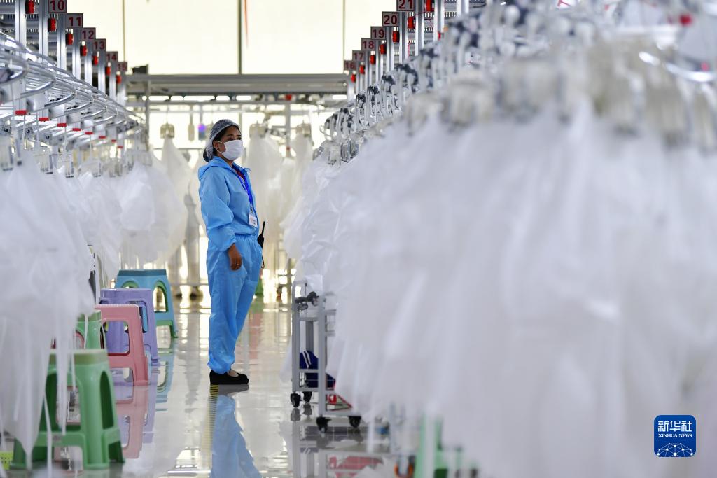 在甘肅省臨夏回族自治州積石山保安族東鄉(xiāng)族撒拉族自治縣,依托東西部扶貧協(xié)作平臺(tái)引進(jìn)的服裝加工企業(yè)甘肅拓奇扶貧車(chē)間的員工在服裝加工生產(chǎn)線上作業(yè)(2020年8月9日攝)。新華社記者 陳斌 攝