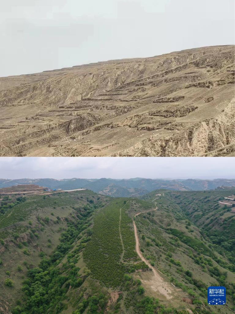 拼版照片:上圖為2013年拍攝的甘肅省慶陽(yáng)市華池縣南梁鎮(zhèn)高臺(tái)村荒山景象(資料圖片,華池縣自然資源局供圖);下圖為2022年5月25日拍攝的甘肅省慶陽(yáng)市華池縣南梁鎮(zhèn)高臺(tái)村萬(wàn)畝苗林示范點(diǎn)景象(無(wú)人機(jī)照片,新華社記者杜哲宇攝)。新華社發(fā)