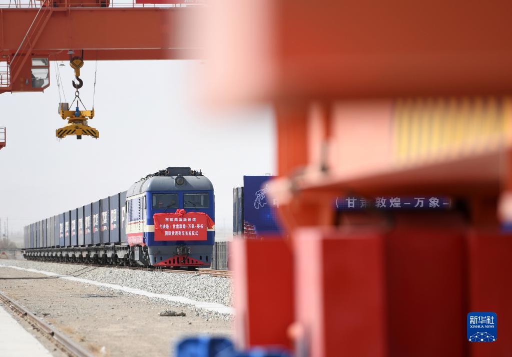 2022年4月21日,甘肅首趟中老鐵路國(guó)際貨運(yùn)列車(chē)在敦煌市鐵路西貨站綜合貨場(chǎng)等待發(fā)車(chē)。新華社記者 陳斌 攝