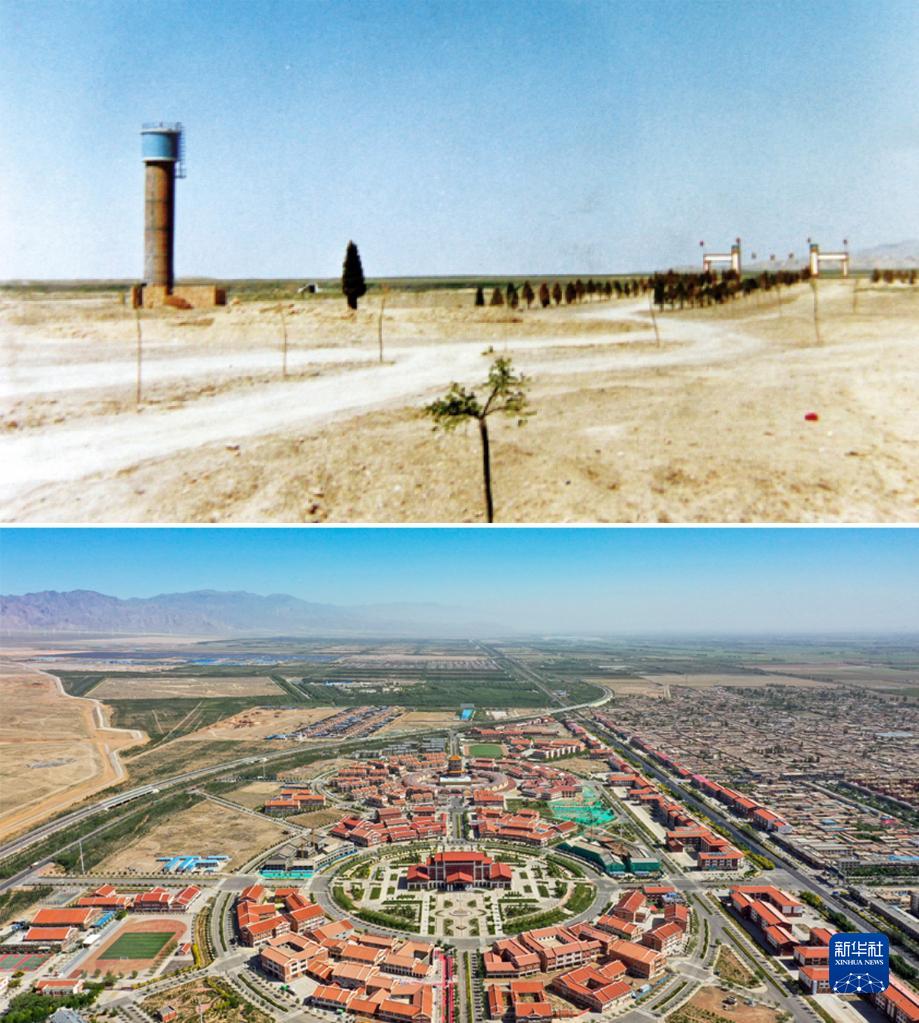 拼版照片:上圖為建設初期的寧夏永寧縣閩寧鎮(zhèn)景象(資料照片);下圖為2021年6月3日拍攝的寧夏永寧縣閩寧鎮(zhèn)(新華社記者馮開華攝,無人機照片)。新華社發(fā)