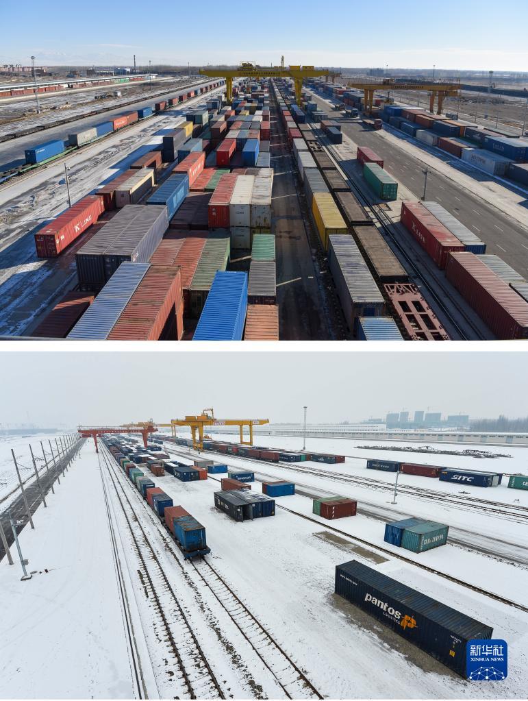 拼版照片:上圖為2021年2月6日拍攝的新疆霍爾果斯鐵路口岸換裝場內的換裝作業(yè)場景(新華社記者 丁磊 攝);下圖為2013年12月25日拍攝的新疆霍爾果斯火車站換裝場(新華社記者 江文耀 攝)。新華社發(fā)