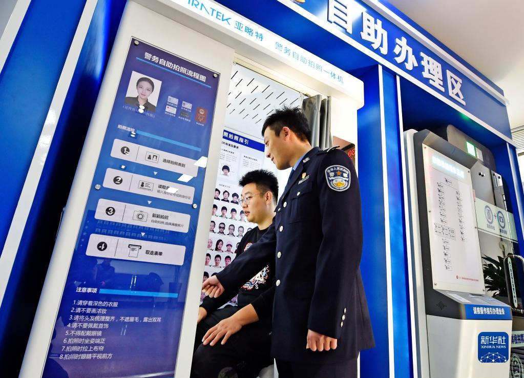 在遼寧省本溪市公安局北地派出所民警指導下,市民通過自助體檢機完成機動車駕駛?cè)藱z測項目(2021年12月10日攝)。新華社發(fā)