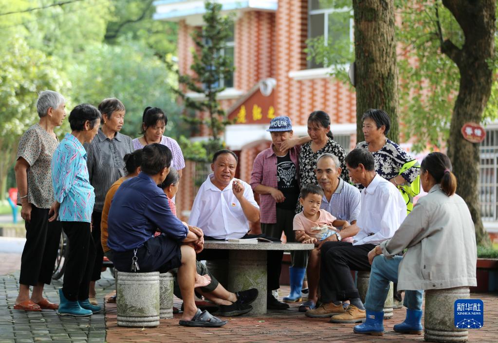 江西蘆溪縣宣風鎮(zhèn)珠亭村人民調(diào)解員陽昌紹(中)為珠亭村的百姓宣講民法典知識(2021年8月17日攝)。新華社記者 胡晨歡 攝