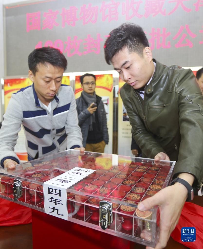 2014年11月15日,國家博物館工作人員搬走天津濱海新區(qū)109枚封存審批公章。新華社發(fā)(付文超 攝)