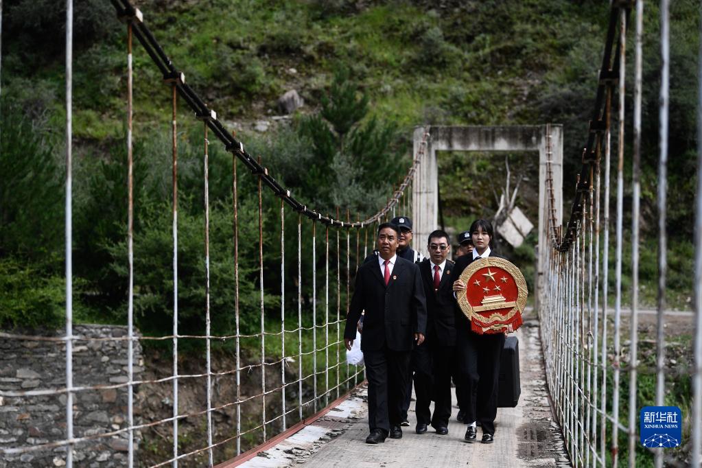 青海省果洛藏族自治州班瑪縣人民法院巡回法庭成員前往班瑪縣燈塔鄉(xiāng)班前村提供法律服務(2021年8月7日攝)。新華社記者 張龍 攝