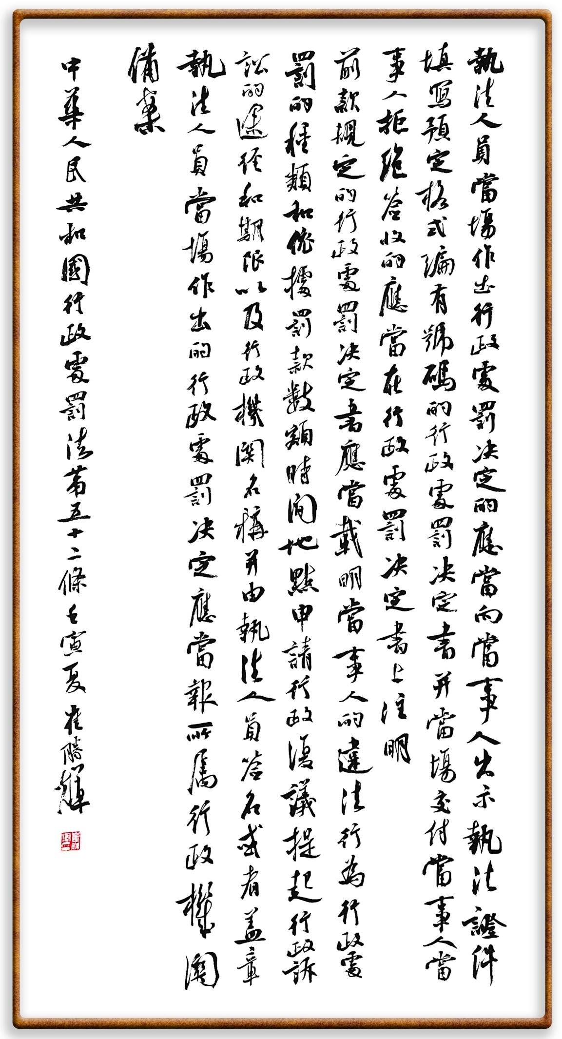 行政處罰法第五十二條 執(zhí)法人員當(dāng)場(chǎng)作出行政處罰決定的,應(yīng)當(dāng)向當(dāng)事人出示執(zhí)法證件,填寫預(yù)定格式、編有號(hào)碼的行政處罰決定書,并當(dāng)場(chǎng)交付當(dāng)事人。當(dāng)事人拒絕簽收的,應(yīng)當(dāng)在行政處罰決定書上注明。