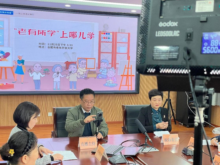 三臺(tái)攝像機(jī)、一個(gè)電子大屏、兩個(gè)補(bǔ)光燈……這是直播現(xiàn)場(chǎng),也是線上協(xié)商議事廳。合肥老年開放大學(xué)內(nèi)的會(huì)議室正在進(jìn)行一場(chǎng)關(guān)于“‘老有所學(xué)’上哪兒學(xué)”的線上協(xié)商議事直播活動(dòng)。