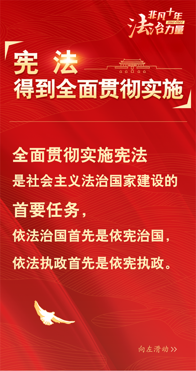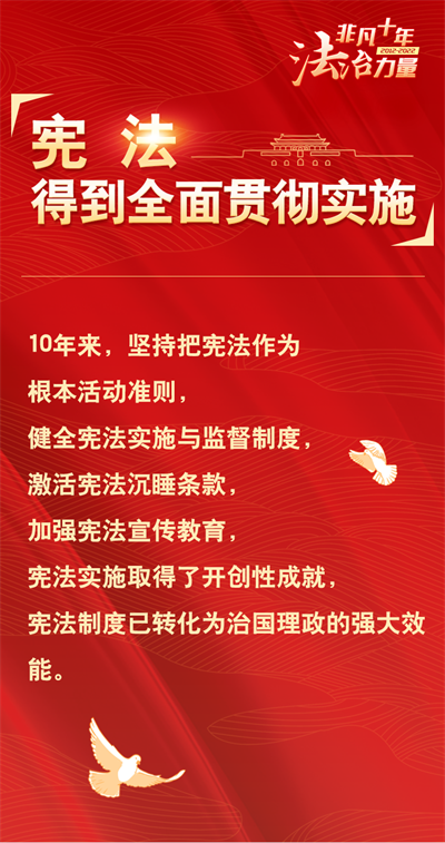 法治網(wǎng)精心策劃制作十期海報,帶您一起領(lǐng)略非凡十年的法治力量!今天為您奉上第三期“憲法得到全面貫徹實施”。